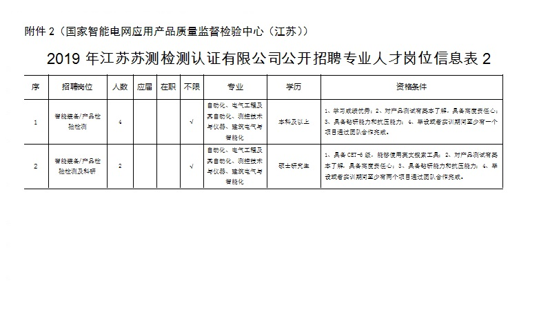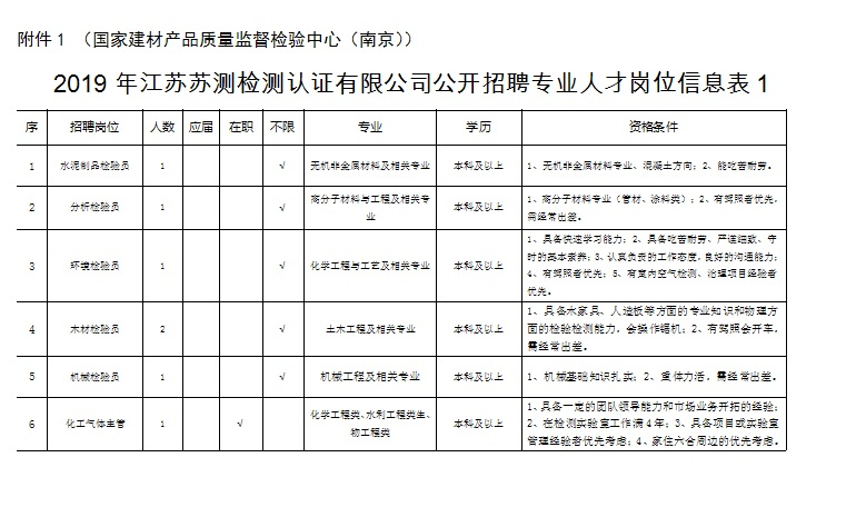 根據(jù)工作需要,江蘇蘇測(cè)檢測(cè)認(rèn)證有限公司(南京市產(chǎn)品質(zhì)量監(jiān)督檢驗(yàn)院全資子公司)委托中智江蘇經(jīng)濟(jì)技術(shù)合作有限公司面向社會(huì)公開(kāi)招聘24名《2019年江蘇蘇測(cè)檢測(cè)認(rèn)證有限公司公開(kāi)招聘專業(yè)人才公告》崗位工作人員,工作地點(diǎn)覆蓋南京市,確定聘用后根據(jù)工作需要統(tǒng)一安排,現(xiàn)將有關(guān)事項(xiàng)公告如下: 一、招聘崗位及人數(shù) 江蘇蘇測(cè)檢測(cè)認(rèn)證有限公司包括水泥制品檢驗(yàn)員、分析檢驗(yàn)員、環(huán)境檢驗(yàn)員、木材檢驗(yàn)員、機(jī)械檢驗(yàn)員、化工氣體主管、化工氣體檢驗(yàn)員、智能裝備/產(chǎn)品檢驗(yàn)檢測(cè)、智能裝備/產(chǎn)品檢驗(yàn)檢測(cè)及科研、紡織品檢驗(yàn)工程師、輕工產(chǎn)品檢驗(yàn)工程師等崗位共招聘24人。 二、資格條件 1.具有中華人民共和國(guó)國(guó)籍,擁護(hù)黨的路線、方針、政策; 2.遵紀(jì)守法,品行端正,具有良好的職業(yè)道德; 3.無(wú)違法違紀(jì)行為,具備正常履行工作職責(zé)的身體條件; 4.具備崗位資格條件(詳見(jiàn)附件:《2019年江蘇蘇測(cè)檢測(cè)認(rèn)證有限公司公開(kāi)招聘專業(yè)人才崗位信息表》) 三、簡(jiǎn)歷投遞方式 報(bào)名方式:本次招聘采取電子郵件報(bào)名方式。電子郵件報(bào)名時(shí),請(qǐng)將郵件主題及應(yīng)聘文檔按“2018年江蘇蘇測(cè)工作人員招聘材料+姓名+崗位”格式命名。 四、聘者需填寫個(gè)人簡(jiǎn)歷或者附件5-《2019年江蘇蘇測(cè)檢測(cè)認(rèn)證有限公司勞務(wù)外包項(xiàng)目報(bào)名表》,并提交求職材料。求職材料包含:(1)登記表或個(gè)人簡(jiǎn)歷上填寫內(nèi)容的證明材料(身份證、畢業(yè)證、學(xué)位證、職稱證、主要科研成果證明及獲獎(jiǎng)證書等材料原件掃描件/復(fù)印件);(2)有海外學(xué)習(xí)工作經(jīng)歷的需提供留學(xué)回國(guó)證明、學(xué)歷認(rèn)證等材料原件掃描件/復(fù)印件。(3)應(yīng)聘崗位所需提供的其他材料原件及復(fù)印件。 應(yīng)聘者請(qǐng)將個(gè)人簡(jiǎn)歷或者附件5-《2019年江蘇蘇測(cè)檢測(cè)認(rèn)證有限公司勞務(wù)外包項(xiàng)目報(bào)名表》及應(yīng)聘證明材料原件掃描并制作成一份PDF格式材料后,發(fā)送至郵箱:617025593@qq.com,相關(guān)咨詢電話:025-86673817 凌老師(工作日9:00-17:00,節(jié)假日除外)。 五、資格審查 1.初審。根據(jù)應(yīng)聘者提供的各種求職材料進(jìn)行資格審查,應(yīng)聘者提供的應(yīng)聘材料須真實(shí)準(zhǔn)確,一經(jīng)發(fā)現(xiàn)應(yīng)聘材料存在虛假不實(shí)之處,經(jīng)核實(shí),取消應(yīng)聘者應(yīng)聘資格,責(zé)任由應(yīng)聘人員自行承擔(dān)。 2.復(fù)審?,F(xiàn)場(chǎng)對(duì)初審合格的應(yīng)聘者提供的各種求職材料原件進(jìn)行資格審查,交驗(yàn)證明材料原件。符合要求的準(zhǔn)許參加面試,不符合要求的取消其面試資格。 六、筆試、面試 符合資格審查的候選人,將統(tǒng)一組織開(kāi)展筆試、面試,進(jìn)行擇優(yōu)選取。 七、體檢、錄用 根據(jù)崗位需要,經(jīng)考試、政審、體檢合格后確定聘用候選人。通過(guò)中智江蘇經(jīng)濟(jì)技術(shù)合作有限公司實(shí)行勞務(wù)外包管理。